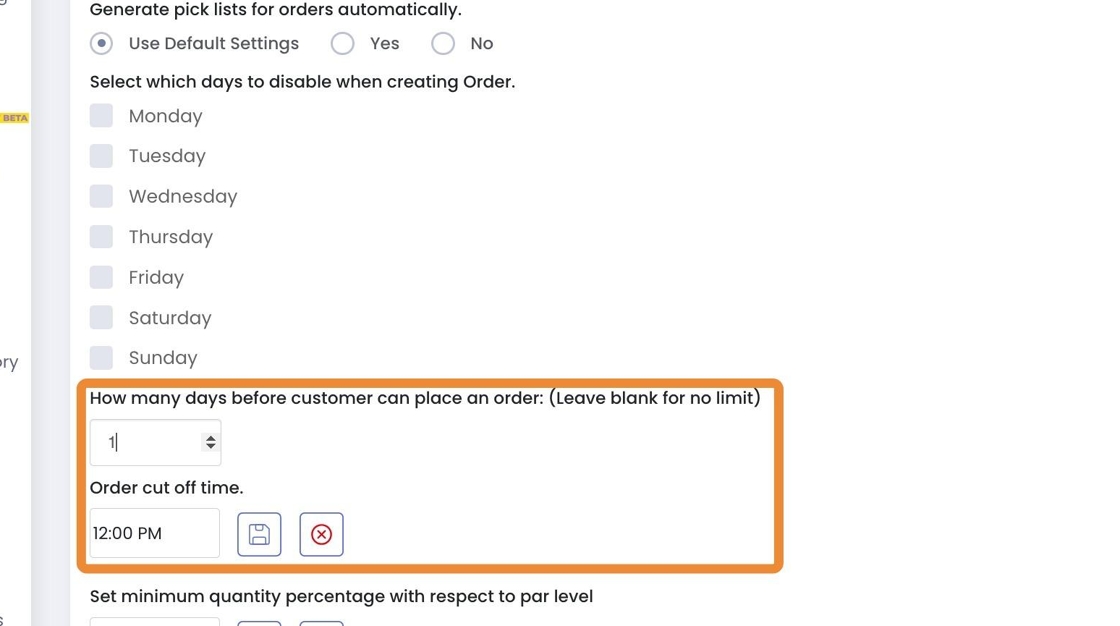 7. You can choose the number of days in advance that the customer must place their order, as well as set the cutoff time.